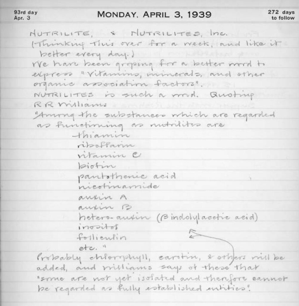 And as told in The Nutrilite Story Third Edition, “he found it buried in a 1928 issue of Science magazine. The word ‘nutrilites’ had been coined by Roger Williams of the University of Oregon (at the time) and was used to describe vitamin-like substances other than the well-recognized nutrients, which in small amounts function in the nutrition of organisms.”